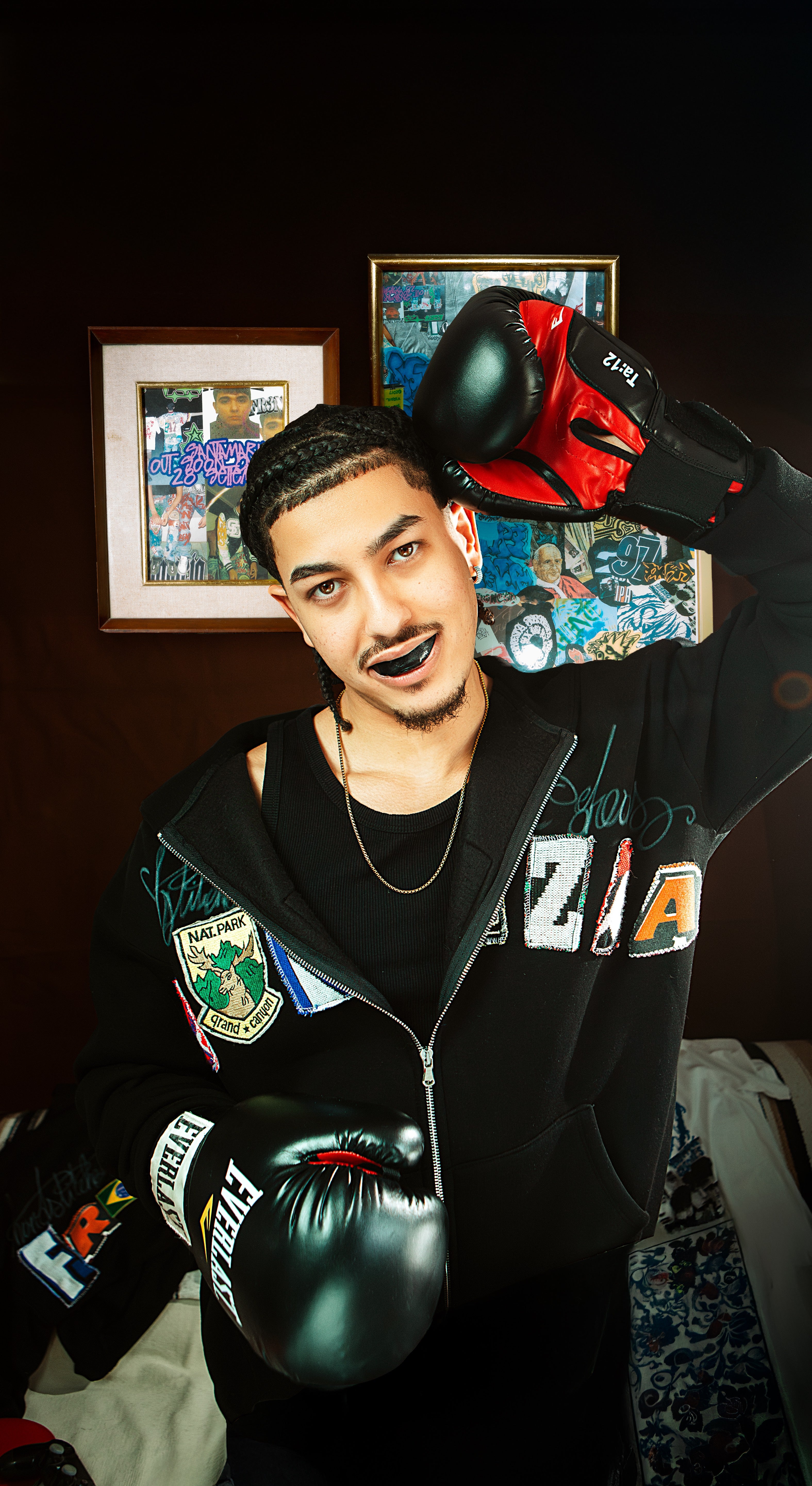 • Black letters zip patchwork hoodie